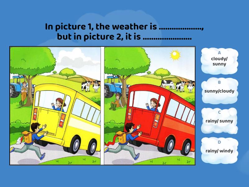 1) In picture 1, the weather is ...................., but in picture 2, it is ....................... a) cloudy/ sunny b) sunny/cloudy c) rainy/ sunny d) rainy/ windy 2) In picture 1, the bus is ...................., but in picture 2, it is ....................... a) red/ yellow b) yellow/ red c) big/ small d) small/big 3) In picture 1, the man ....................under the tree, but in picture 2, he ....................... under the tree a) is sitting/ is standing b) is standing/ is sitting 4) In picture 1, there ...................., but in picture 2, there .......................  a) are two cows/ are three cows b) is two cows/ is three cows 5) In picture 1, the boy has got .................... in his schoolbag , but in picture 2, he has got ....................... in his bag. a) a scarf/ a book b) a book/ a scarf