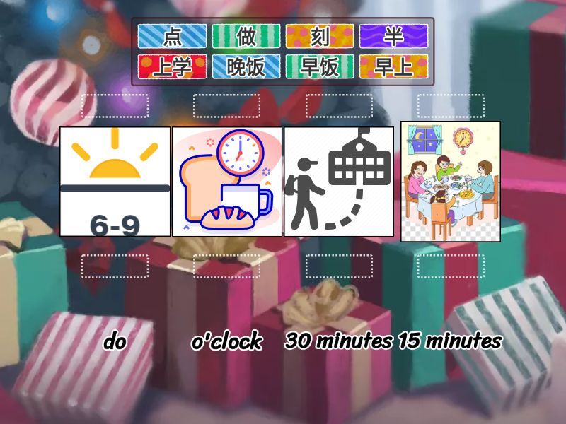 中学生, 早上, 上午, 中午, 下午, 晚上, 点 - o'clock, 分 - minute, 半 - 30 minutes, 刻 - 15 minutes, 吃, 早饭, 起床, 上学, 放学, 午饭, 晚饭, 做 - do, 作业, 现在, 睡觉, 回家,