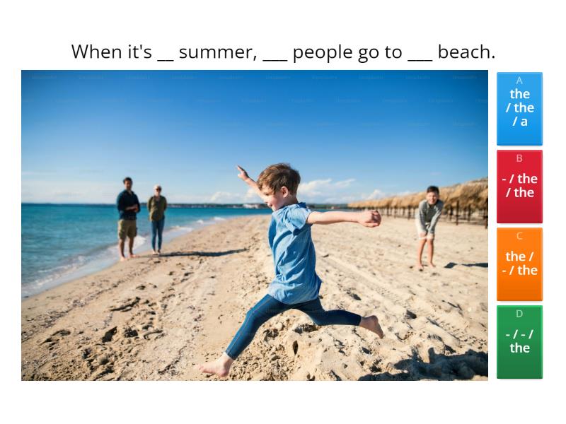 1) When it's __ summer, ___ people go to ___ beach. a) the / the / a b) - / the / the c) the / - / the d) - / - / the 2) __ children should be raised with __ love. a) the / - b) a / - c) - / the d) - / - 3) __ new trafic rule was set last week. __ new regulation forces us to buckle __ safety belts inside de car. a) a / - / the b) a / the / - c) the / a / - d) the / - / the 4) None of __ participants attended __ meeting but __ unregistered woman did. a) the / a / - b) the / - / an c) the / the / an d) the / an / -