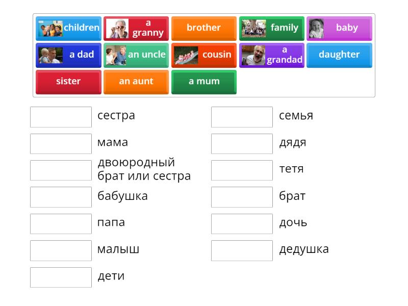 a granny - бабушка, a grandad - дедушка, a dad - папа, a mum - мама, an aunt - тетя, an uncle - дядя, brother - брат, sister - сестра, cousin - двоюродный брат или сестра, children - дети, baby - малыш, family - семья, daughter - дочь,