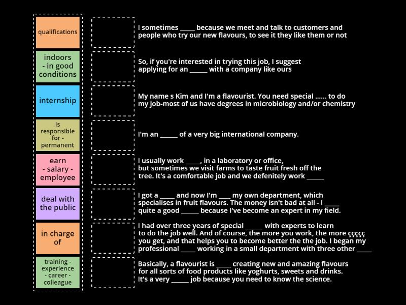 qualifications - My name s Kim and I'm a flavourist. You need special ...... to do my job-most of us have degrees in microbiology and/or chemistry, is responsible for - permanent - Basically, a flavourist is _____ creating new and amazing flavours for all sorts of food products like yoghurts, sweets and drinks. It's a very ______ job because you need to know the science., training - experience - career - colleague - I had over three years of special ______ with experts to learn to do the job well. And of course, the more you work, the more ççççç you get, and that helps you to become better the the job. I began my professional _____ working in a small department with three other _____, in charge of - I got a _____ and now I'm ____ my own department, which specialises in fruit flavours. The money isn't bad at all - I _____ quite a good ______ because I've become an expert in my field., earn - salary - employee - I'm an ______ of a very big international company. , indoors - in good conditions - I usually work _____, in a laboratory or office, but sometimes we visit farms to taste fruit fresh off the tree. It's a comfortable job and we defenitely work ______ , deal with the public - I sometimes _____ because we meet and talk to customers and people who try our new flavours, to see it they like them or not, internship - So, if you're interested in trying this job, I suggest applying for an ______ with a company like ours,
