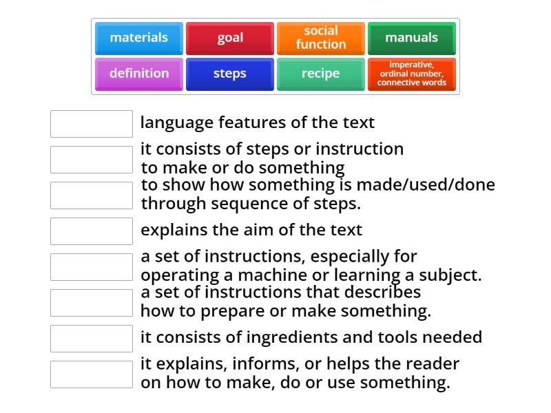 goal - it explains, informs, or helps the reader on how to make, do or use something., imperative, ordinal number, connective words - to show how something is made/used/done through sequence of steps., recipe - explains the aim of the text, definition - it consists of ingredients and tools needed, materials - it consists of steps or instruction to make or do something, steps - a set of instructions, especially for operating a machine or learning a subject., social function - a set of instructions that describes how to prepare or make something., manuals - language features of the text,