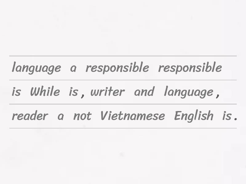 While Vietnamese is a reader responsible language, English is not, and is a writer responsible language. , English is a writer responsible language. In contrast, Vietnamese is a reader responsible one. , While the lack of sounds make people wonder if sign language is a real language, it is now widely accepted that sign language is a real language. , Sign language is a grammatical language; similarly, spoken languages are the same. , Spoken languages usually have complicated grammar; In the same way, sign language also has the same. , While spoken language have written forms, sign language tends to rely on real time communication, not writing forms. , Vietnamese is a tonal language, while English is not and tends to use intonation and stress more. , Both English and Vietnamese have a subject verb object order. , English starts with a subject then a verb, similarly Vietnamese does the same. , Unlike Vietnamese and English that is subject, verb then object, Japanese, for example, is subject, object, then verb.,