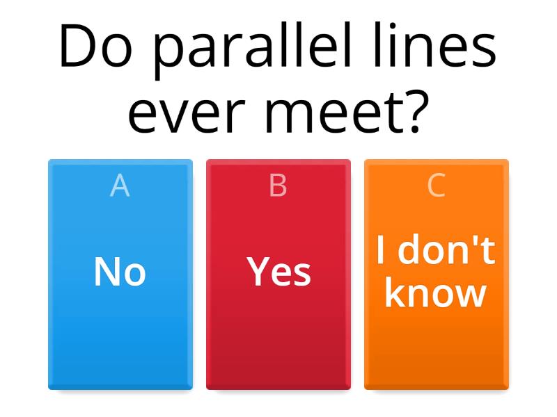 1) Do parallel lines ever meet? a) No b) Yes c) I don't know 2) What type of line is this? a) Parallel lines b) Perpendicular lines c) Intersecting lines d) None of these answers are correct 3) What type of lines is this? a) Intersecting lines b) Parallel lines c) Perpendicular lines d) None of these answers are correct 4) What type of line is this? a) Perpendicular lines b) Intersecting lines c) Parallel lines d) None of these answers are correct 5) Do perpendicular lines ever meet? a) No b) Yes c) I don't know. 6) Do intersecting lines every meet? a) No b) Yes c) I don't know. 7) Is a perpendicular line also an intersecting line? a) No b) Yes c) I don't know. 8) Which line forms 90 degree angels? a) Intersecting lines b) Parallel lines c) Perpendicular lines.