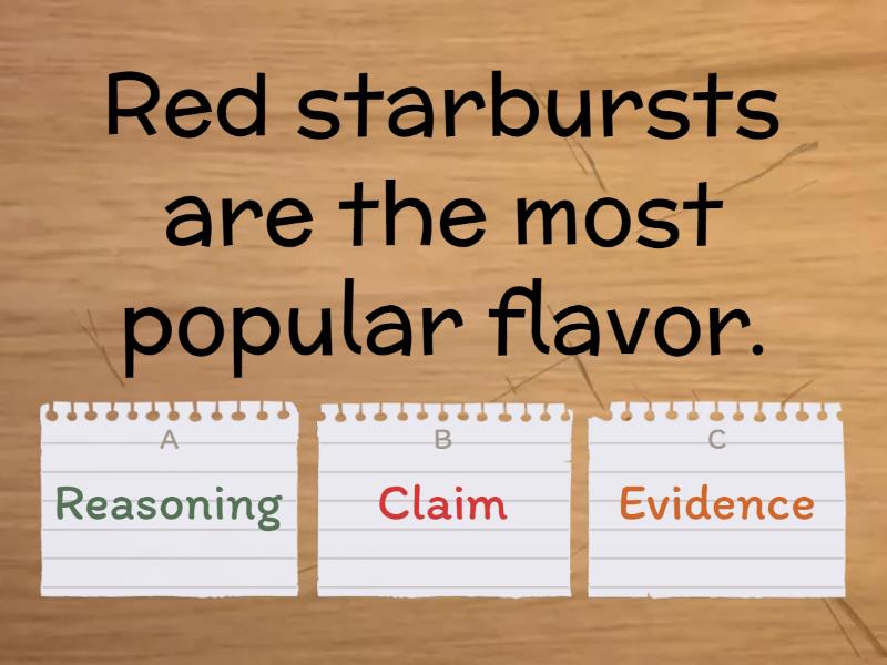 1) The Hulk is the strongest Avenger. a) Claim b) Evidence c) Reasoning 2) The dictionary says a sandwich is 2 pieces of bread with some filling. a) Claim b) Evidence c) Reasoning 3) A North Carroll cafeteria lunch is healthy meal. a) Claim b) Evidence c) Reasoning 4) 100% of North Carroll school lunches include fruits and vegetables. a) Claim b) Evidence c) Reasoning 5) A quesadilla is a sandwich. a) Claim b) Evidence c) Reasoning 6) North Carroll School lunches must be healthy because they include important nutrients. a) Claim b) Evidence c) Reasoning 7) Cherry is the favorite flavor because kids are picking it more than any other flavor. a) Claim b) Evidence c) Reasoning 8) No other Avengers can lift a building, so Hulk has to be the strongest. a) Claim b) Evidence c) Reasoning 9) A quesadilla counts as a sandwich because the tortilla acts as the bread. a) Claim b) Evidence c) Reasoning 10) In an experiment, students chose red starbursts first 75% of the time. a) Claim b) Evidence c) Reasoning 11) In the movies, the Hulk lifts an entire building. a) Claim b) Evidence c) Reasoning 12) Red starbursts are the most popular flavor. a) Claim b) Evidence c) Reasoning