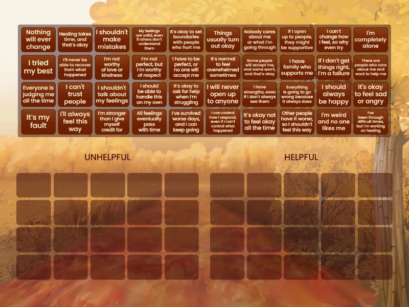 UNHELPFUL: I’ll never be able to recover from what happened, Everyone is judging me all the time, I have to be perfect, or no one will accept me, It’s my fault, Nobody cares about me or what I’m going through, I'll always feel this way, I can't trust people, I shouldn't make mistakes, I shouldn't talk about my feelings, I’m not worthy of love or kindness, Everything is going to go wrong because it always does, I'm completely alone, I'm weird and no one likes me, Nothing will ever change, If I don’t get things right, I’m a failure, I should always be happy, Other people have it worse, so I shouldn’t feel this way, I should be able to handle this on my own, I can’t change how I feel, so why even try, I will never open up to anyone, HELPFUL: It's okay to feel sad or angry, If I open up to people, they might be supportive, I’ve been through difficult times, but I’m working on healing, It’s okay not to feel okay all the time, I have strengths, even if I don’t always see them, Some people will accept me, and some won’t, and that’s okay, I’m not perfect, but I’m worthy of respect, Healing takes time, and that’s okay, I can control how I respond, even if I can’t control what happened, It’s okay to ask for help when I’m struggling, My feelings are valid, even if others don’t understand them, There are people who care about me and want to help me, It’s normal to feel overwhelmed sometimes, Things usually turn out okay, I have family who supports me, I’m stronger than I give myself credit for, It’s okay to set boundaries with people who hurt me, I’ve survived worse days, and I can keep going, I tried my best, All feelings eventually pass with time,