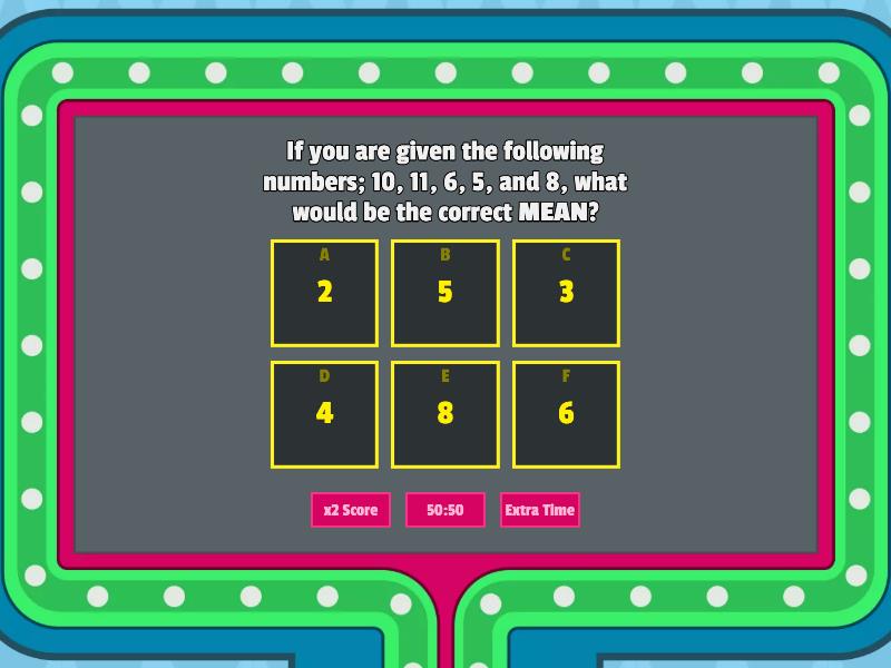 1) If you are given the following numbers; 10, 11, 6, 5, and 8, what would be the correct MEAN? a) 2 b) 5 c) 3 d) 4 e) 8 f) 6 2) If you are given the following numbers; 10, 11, 6, 5, and 8, what would be the correct MEDIAN? a) 8 b) 11 c) 5 d) 10 e) 8 1/2 f) 6 3) If you are given the following numbers; 10, 11, 6, 5, and 8, what would be the correct MODE? a) 10 b) 11 c) There is no mode. d) 6 e) 5 f) 8 4) If you are given the following numbers; 6, 13, 4, 3, 11, 5, 3, 15, and 3, what would be the correct MEAN? a) 3 b) 2 c) 9 d) 5 e) 6 f) 7 5) If you are given the following numbers; 6, 13, 4, 3, 11, 5, 3, 15, and 3, what would be the correct MEDIAN? a) 7 b) 5 1/2 c) 6 d) 5 e) 3 f) 11 6) If you are given the following numbers; 6, 13, 4, 3, 11, 5, 3, 15, and 3, what would be the correct MODE? a) 4 b) There is no mode. c) 3 d) 7 e) 13 f) 2 7) If you are given the following numbers; 7, 3, 15, 2, 2, 2, 9, 4, 11, 2, 5, 6, 2, 8, 1, and 1, what would be the correct MEAN? a) 3 b) 6 c) 7 d) 4 e) 2 f) 5 8) If you are given the following numbers; 7, 3, 15, 2, 2, 2, 9, 4, 11, 2, 5, 6, 2, 8, 1, and 1, what would be the correct MEDIAN? a) 3 1/2 b) 2 c) 3 d) 4 e) 9 f) 7 1/2 9) If you are given the following numbers; 7, 3, 15, 2, 2, 2, 9, 4, 11, 2, 5, 6, 2, 8, 1, and 1, what would be the correct MODE? a) 15 b) 7 c) 3 d) 1 e) 2 f) There is no mode.