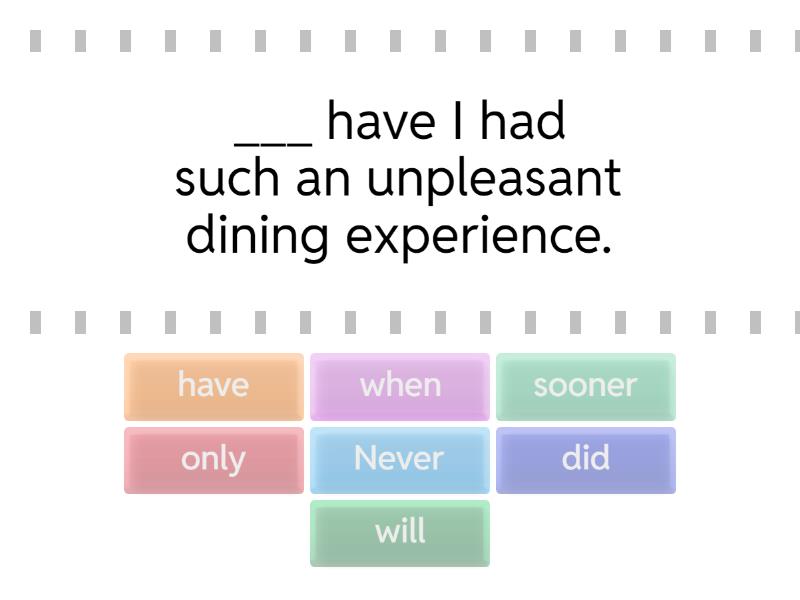 Never - ___ have I had such an unpleasant dining experience., only - Not ___ was the restaurant in need of cleaning, but it was also overcrowded., have - Rarely____ I been treated so rudely by staff in a restaurant., will - Never again___ my husband and I return to this restaurant., when - Hardly had we sat down at our table ___ the waiter told us to move again., did - Not until two hours later ____ our meal finally arrive., sooner - No ____ had we started eating than we noticed that our chicken was uncooked.,