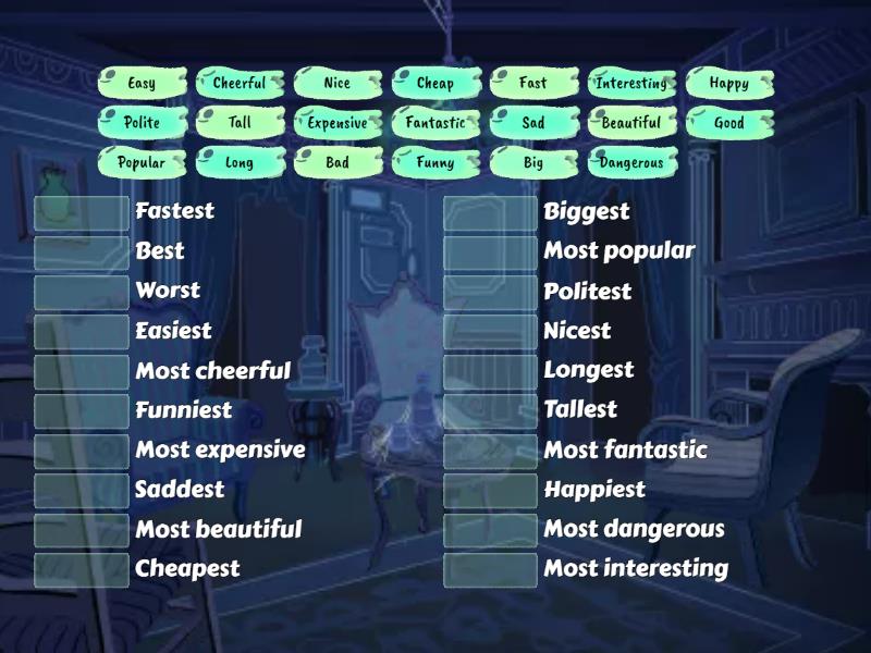 Tall - Tallest, Popular - Most popular, Long - Longest, Fast - Fastest, Happy - Happiest, Easy - Easiest, Funny - Funniest, Polite - Politest, Cheerful - Most cheerful, Good - Best, Bad - Worst, Fantastic - Most fantastic, Big - Biggest, Expensive - Most expensive, Nice - Nicest, Sad - Saddest, Interesting - Most interesting, Cheap - Cheapest, Beautiful - Most beautiful, Dangerous - Most dangerous,