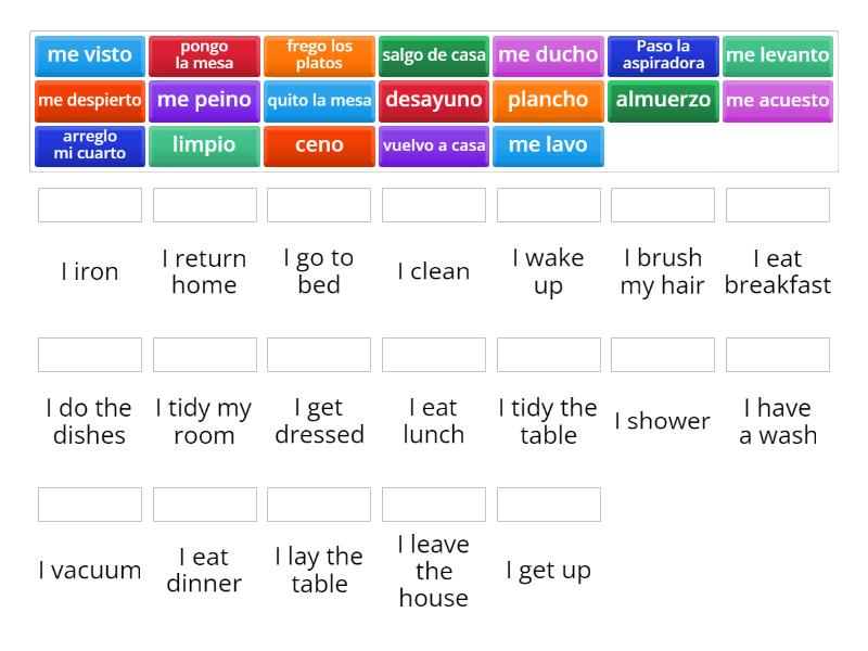 me despierto - I wake up, me levanto - I get up, me ducho - I shower, me visto - I get dressed, me peino - I brush my hair, salgo de casa - I leave the house, vuelvo a casa - I return home, almuerzo - I eat lunch, desayuno - I eat breakfast, ceno - I eat dinner, me acuesto - I go to bed, me lavo - I have a wash, arreglo mi cuarto - I tidy my room, Paso la aspiradora - I vacuum, plancho - I iron, pongo la mesa - I lay the table, quito la mesa - I tidy the table, frego los platos - I do the dishes, limpio - I clean,