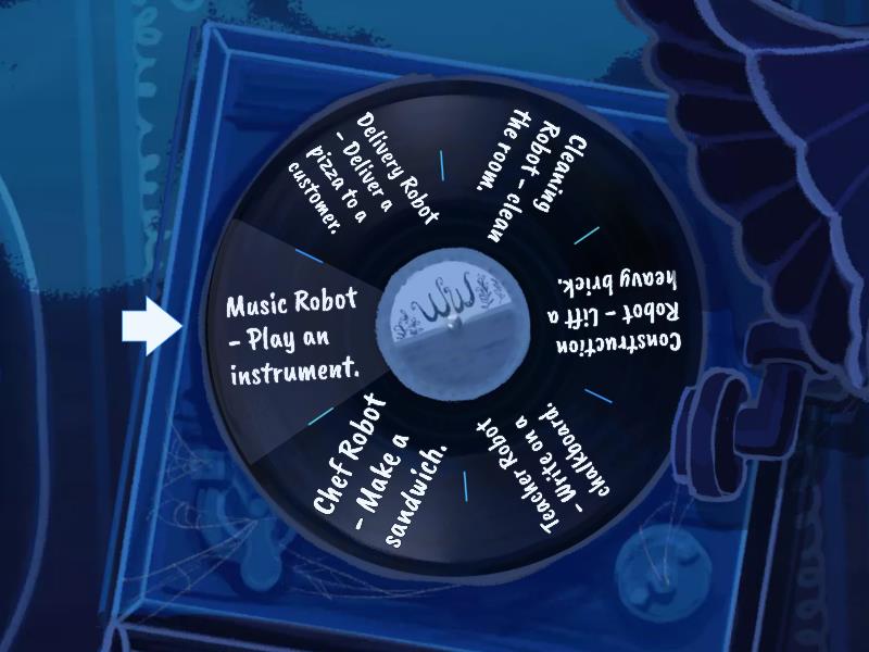 1) Delivery Robot - Deliver a pizza to a customer. 2) Cleaning Robot - clean the room. 3) Construction Robot - Lift a heavy brick. 4) Teacher Robot - Write on a chalkboard. 5) Chef Robot - Make a sandwich. 6) Music Robot - Play an instrument.
