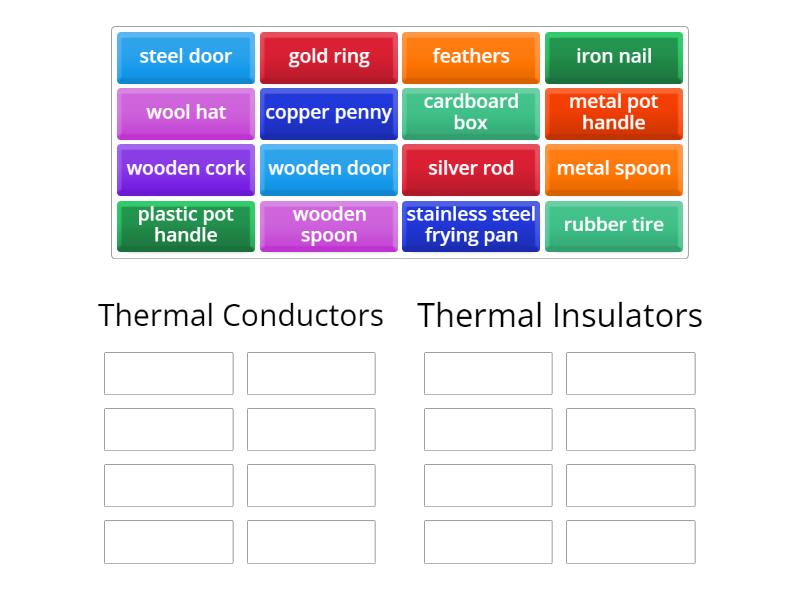 Thermal Conductors: silver rod, iron nail, copper penny, metal spoon, stainless steel frying pan, steel door, metal pot handle, gold ring, Thermal Insulators: wooden spoon, cardboard box, wooden cork, rubber tire, wool hat, wooden door, feathers, plastic pot handle,