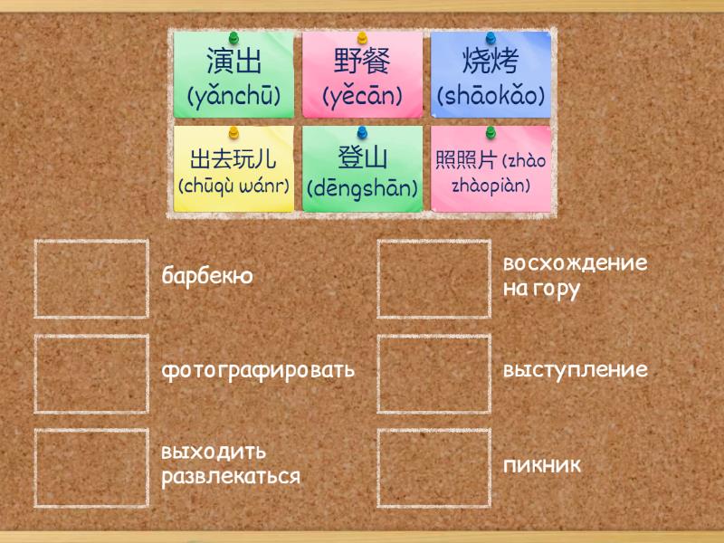 野餐 (yěcān) - пикник, 登山 (dēngshān) - восхождение на гору, 烧烤 (shāokǎo) - барбекю, 演出 (yǎnchū) - выступление, 照照片 (zhào zhàopiàn) - фотографировать, 出去玩儿 (chūqù wánr) - выходить развлекаться,