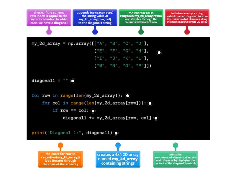 creates a 4x4 2D array named my_2d_array containing strings, initialises an empty string variable named diagonal1 to store the concatenated elements along the main diagonal of the 2D array, the outer for row in range(len(my_2d_array)) loop iterates through the rows of the 2D array, the inner for col in range(len(my_2d_array[row])) loop iterates through the columns within each row, checks if the current row index is equal to the current col index. In which case, we have a diagonal, appends (concatenates) the string value at my_2d_array[row, col] to the diagonal1 string, prints the concatenated elements along the main diagonal by displaying the content of the diagonal1 variable.
