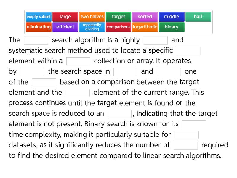 The ____ search algorithm is a highly ____ and systematic search method used to locate a specific ____ element within a ____ collection or array. It operates by ____ the search space in ____ and ____ one of the ____ based on a comparison between the target element and the ____ element of the current range. This process continues until the target element is found or the search space is reduced to an ____, indicating that the target element is not present. Binary search is known for its ____ time complexity, making it particularly suitable for ____ datasets, as it significantly reduces the number of ____ required to find the desired element compared to linear search algorithms.