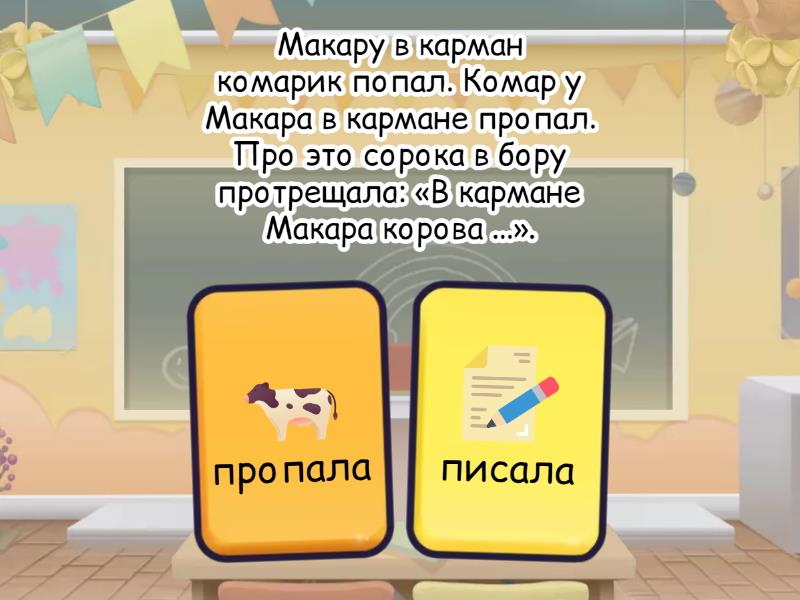 1) Жарким солнышком согретый, смотрит гриб из-под берета. Рассмотрел берет грибник. Под беретом — ... a) боровик b) ледник 2) Попросите у Трофима рассказать вам про налима. Попросите у Петра рассказать про ... a) столяра b) осетра 3) Принесла в корзине Рая три румяных каравая. Раздала всем поровну: двум грачам и ... a) ворону b) вагону 4) Мы проказника-крота отругали неспроста. Перерыл, испортил крот наш красивый ... a) дымоход b) огород 5) Макару в карман комарик попал. Комар у Макара в кармане пропал. Про это сорока в бору протрещала: «В кармане Макара корова ...». a) писала b) пропала 6) Скроил скворец сороконожке сороконожкины сапожки. Сошьет скворец исправно в срок все сорок скроенных... a) сапог b) пирог 7) Погрузил Егор на санки триста тридцать три баранки. Санки быстро развалились - все баранки... a) приснились b) раскатились 8) Дрозды на дереве сидят, рябину дружно теребят. Дрозды дружны, дрозды — друзья. Дроздов огромная... a) семья b) скамья