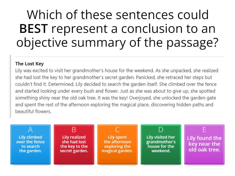 1) Which of these sentences could BEST represent a conclusion to an objective summary of the passage? a) Lily climbed over the fence to search the garden. b) Lily realized she had lost the key to the secret garden. c) Lily spent the afternoon exploring the magical garden. d) Lily visited her grandmother’s house for the weekend. e) Lily found the key near the old oak tree. 2) Which of these DOES NOT belong in an objective summary? a) Opinions b) Major details from the text c) Relevant story events d) Author's name or title of the text