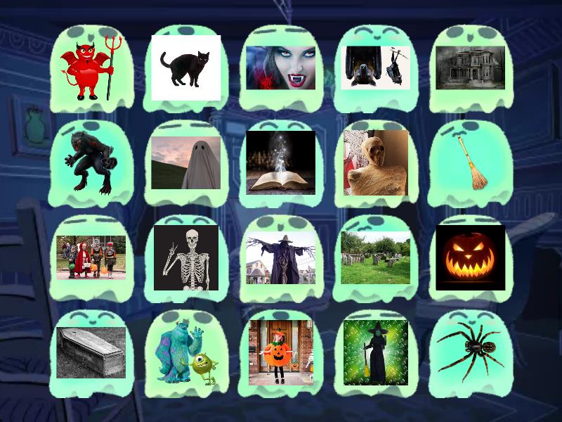 A ghost, A coffin, A graveyard, The devil, A broom, A pumpkin, A haunted house, A werewolf, A black cat, A monster, A bat, A scarecrow, a spell, trick or treat, A vampire, A witch, A costume, A spider, A skeleton, A mummy,