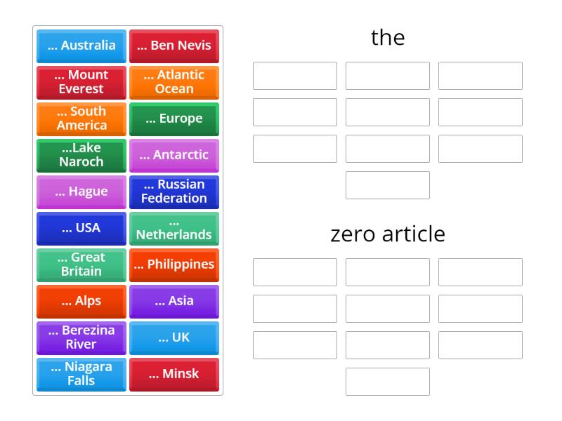 the: ... UK, ... Hague, ... Berezina River, ... Alps, ... Netherlands, ... Russian Federation, ... Niagara Falls, ... Philippines, ... USA, ... Atlantic Ocean, zero article: ... Great Britain, ... Ben Nevis, ...Lake Naroch, ... Mount Everest, ... Minsk, ... Europe, ... South America, ... Antarctic, ... Australia, ... Asia,