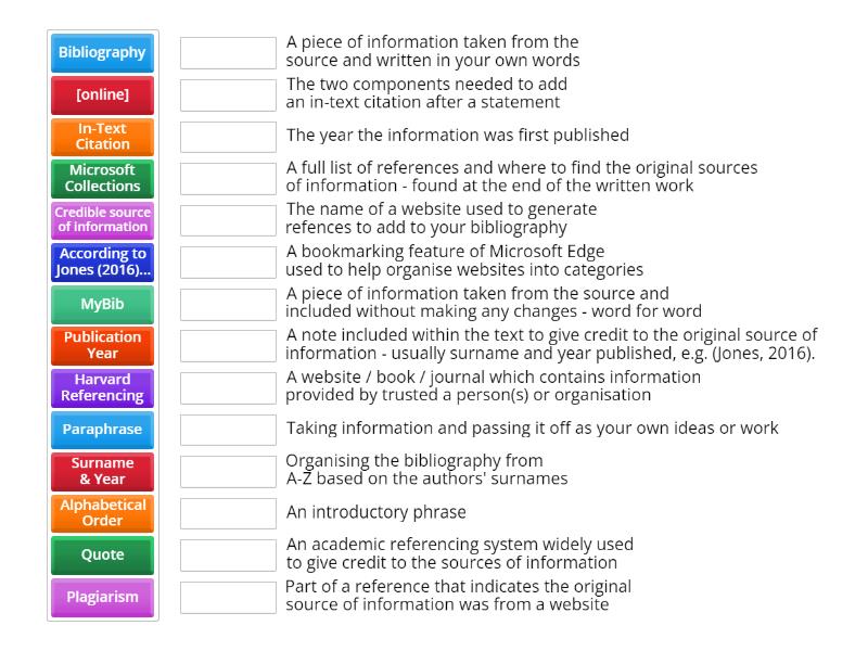 In-Text Citation - A note included within the text to give credit to the original source of information - usually surname and year published, e.g. (Jones, 2016)., Quote - A piece of information taken from the source and included without making any changes - word for word, Paraphrase - A piece of information taken from the source and written in your own words, Harvard Referencing - An academic referencing system widely used to give credit to the sources of information, Bibliography - A full list of references and where to find the original sources of information - found at the end of the written work, According to Jones (2016)... - An introductory phrase , Publication Year - The year the information was first published, [online] - Part of a reference that indicates the original source of information was from a website, Surname & Year - The two components needed to add an in-text citation after a statement, Alphabetical Order - Organising the bibliography from A-Z based on the authors' surnames, MyBib - The name of a website used to generate refences to add to your bibliography, Microsoft Collections - A bookmarking feature of Microsoft Edge used to help organise websites into categories, Credible source of information - A website / book / journal which contains information provided by trusted a person(s) or organisation, Plagiarism - Taking information and passing it off as your own ideas or work,