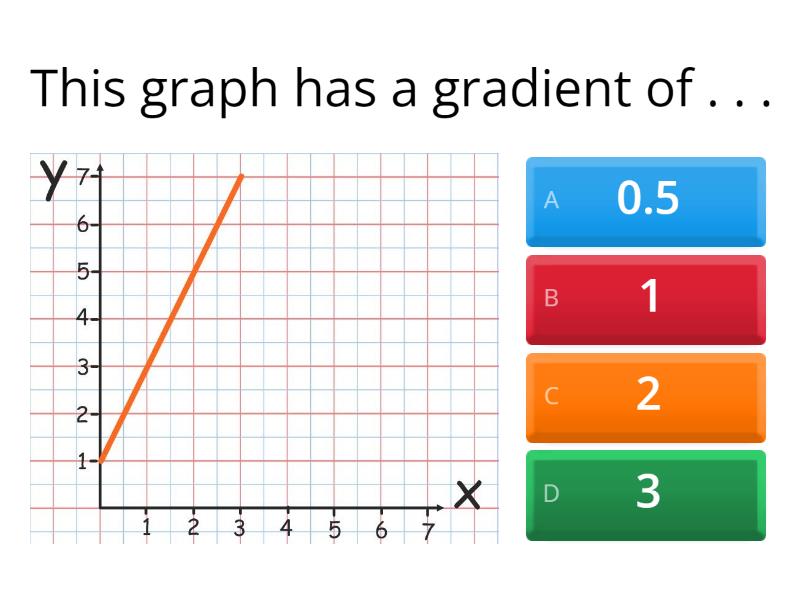 1) This graph has a gradient of . . . a) 0.5 b) 1 c) 2 d) 3 2) This graph has a gradient of . . . a) 0 b) 1 c) 2 d) 3 3) This graph has a gradient of . . . a) 0 b) 1 c) 2 d) 3 4) This graph has a gradient of . . . a) 1 b) 2 c) 3 d) 4 5) This graph has a gradient of . . . a) 0 b) 0.5 c) 1 d) 2 6) This graph has a gradient of . . . a) 0.5 b) -0.5 c) 2 d) -2 7) This graph has a gradient of . . . a) 0 b) 0.5 c) 1 d) 2 8) This graph has a gradient of . . . a) 0 b) 0.5 c) 1 d) 2 9) This graph has a gradient of . . . a) 0 b) 0.5 c) 1 d) 2 10) This graph has a gradient of . . . a) undefined b) -1 c) 0 d) 1 e) 1,000 f) ∞