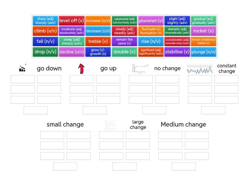 go down: decrease (n/v), fall (n/v), drop (n/v), decline (n/v), plunge (n/v), plummet (v), go up: increase (n/v), rise (n/v), grow (v)- growth (n), double (v), treble (v), rocket (v), climb (v/n), no change: level off (v), remain the same (v), remain (relatively) stable (v), stabilise (v), constant change: fluctuate (v) fluctuation (n), small change: slight (adj) slightly (adv), gradual (adj) gradually (adv), large change: considerable (adj) considerably (adv), sharp (adj) sharply (adv), dramatic (adj) dramatically (adv), significant (adj) significantly (adv), substantial (adj) substantially (adv), steep (adj) steeply (adv), Medium change: moderate (adj) moderately (adv), steady (adj) steadily (adv),