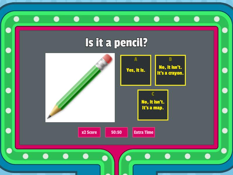 1) Is it a pencil? a) Yes, it is. b) No, it isn't. It's a crayon. c) No, it isn't. It's a map. 2) Is it a red pen? a) Yes, it is. b) No, it isn't. It's an orange pen. c) No, it isn't. It's a purple pen. 3) Is it a board? a) No, it isn't. It's a table. b) No, it isn't. It's a clock. c) Yes, it is. 4) Is it a yellow crayon? a) Yes, it is. b) No, it isn't. It's a black crayon. c) No, it isn't. It's a pink crayon. 5) Is it a black board? a) No, it isn't. It's a white board. b) Yes, it is. c) No, it isn't. It's a blue board. 6) Is it a brown pencil? a) Yes, it is. b) No, it isn't. It's a blue pencil. c) No, it isn't. It's a grey pencil. 7) Is it a red crayon? a) Yes, it is. b) No, it isn't. It's a red clock. c) No, it isn't. It's a red table. 8) Is it a white table? a) No, it isn't. It's a purple table. b) No, it isn't. It's a grey table. c) Yes, it is. 9) Is it a purple pencil? a) Yes, it is. b) No, it isn't. It's a purple pen. c) No, it isn't. It's a purple crayon. 10) Is it a classroom? a) No, it isn't. It's a map. b) Yes, it is. c) No, it isn't. It's a table. 11) Is it a grey pen? a) No, it isn't. It's a blue pen. b) No, it isn't. It's a brown pen. c) Yes, it is.