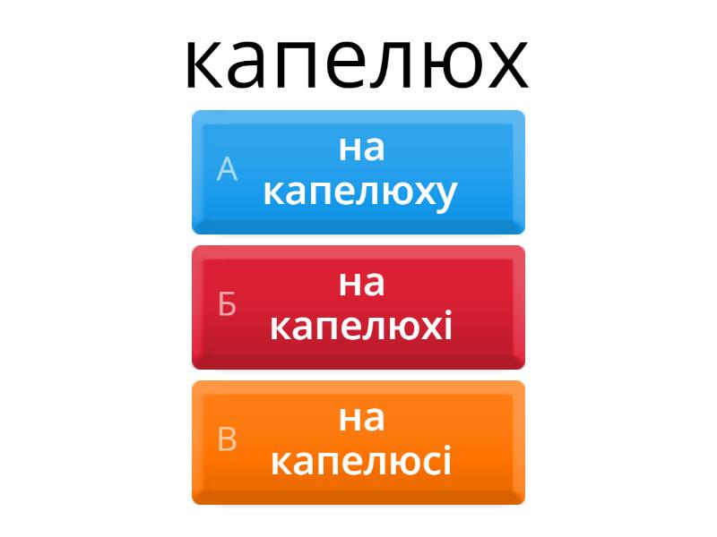 1) капелюх a) на капелюху b) на капелюхі c) на капелюсі 2) нога a) на ногі b) на нозі c) на ногє 3) дівчинка a) на дівчинкі b) на дівчинкє c) на дівчинці 4) вухо a) на вухі b) на вухові c) на вусі 5) дорога a) на дорозі b) на дорогі c) на дорогє 6) кулак a) у кулаку b) у кулаці c) у кулакє 7) кожух a) у кожухє b) у кожуці c) у кожусі 8) клітка a) у клітці b) у клєткє c) у кліткі 9) тарілка a) на тарілкі b) на тарілці c) на тарілеці 10) Ольга a) на Ользі b) на Ольгі c) на Ольці 11) невдаха a) на невдаху b) на невдаці c) на невдасі