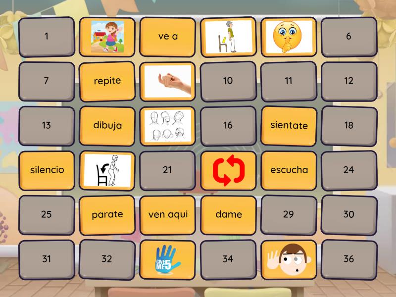 parate, sientate, escucha, silencio, repite, ve a, ven aqui, dame, dibuja, mira, escribe, lee, levanta, ayuda, practica, baño, manos, español,