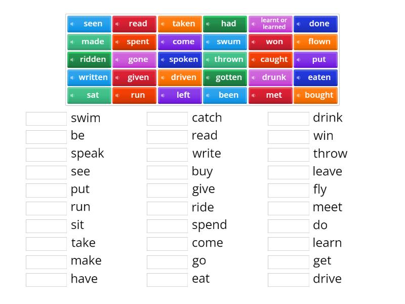 been - be, bought - buy, caught - catch, come - come, done - do, drunk - drink, driven - drive, eaten - eat, flown - fly, gotten - get, given - give, gone - go, had - have, learnt or learned - learn, left - leave, made - make, met - meet, put - put, read - read, ridden - ride, run - run, seen - see, sat - sit, spoken - speak, spent - spend, swum - swim, taken - take, thrown - throw, won - win, written - write,