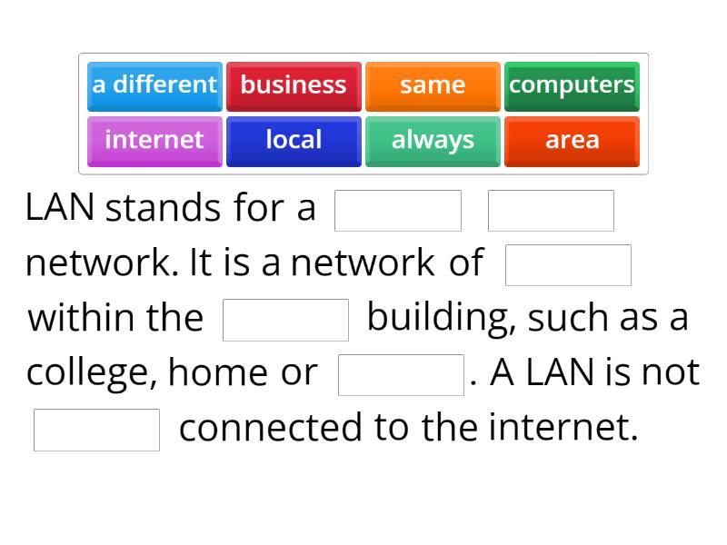 LAN stands for a ____ ____ network. It is a network of ____ within the ____ building, such as a college, home or ____. A LAN is not ____ connected to the internet. WAN stands for a ____ ____ network. It is created when ____ are ____. This requires media such as network ____, and can connect up organisations based in ____ geographical places. The ____ is a WAN. A VPN stands for ____ ____ network. is usually hosted securely on another network, such as the ____, to provide connectivity. VPNs are often used when working on ____ information held by a company or school.