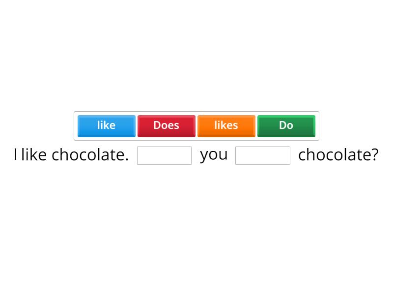 I like chocolate. ____ you ____ chocolate? She lives in Bradford. ____ he ____ in Bradford too? They study English every Friday. ____ you ____ on Fridays too? She ____ not eat pork. Do you ____ pork? We go to the gym on Mondays. ____ he ____ to the gym too? They ____ not like cabbage. Do you ____ it? I ____ not understand. Do you ____? She does not ____ by bus. ____ he come by bus? They ____ not like their teacher. Do you ____ your teacher? He ____ work at 5 o'clock. ____ she finish at 5 o'clock too?Do