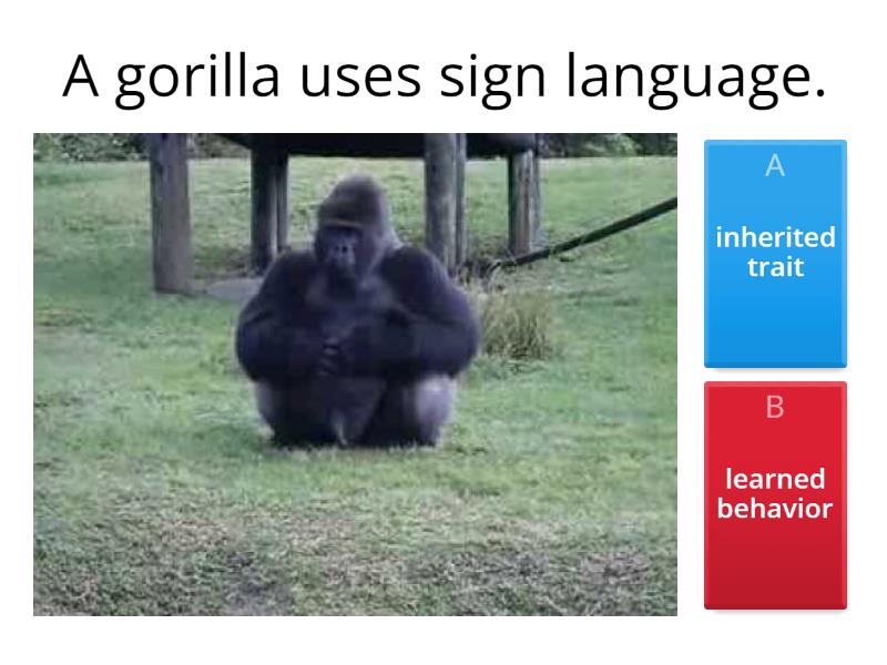1) A gorilla uses sign language. a) inherited trait b) learned behavior 2) A monkey knows which tree has the most fruit. a) inherited trait b) learned behavior 3) A cat has blue eyes. a) inherited trait b) learned behavior 4) A porcupine has sharp quills. a) inherited trait b) learned behavior 5) A rose has a sweet smell. a) inherited trait b) learned behavior 6) A Yucca plant blooms flowers. a) inherited trait b) learned behavior 7) A turtle has a hard shell. a) inherited trait b) learned behavior 8) An elephant walks on its back legs at the circus when the trainer whistles. a) inherited trait b) learned behavior 9) Some fish have wide tailed fins. a) inherited trait b) learned behavior 10) A seagull that has been fed by tourists at the beach returns to the area for food. a) inherited trait b) learned behavior 11) A parrot imitates a barking dog. a) inherited trait b) learned behavior 12) A herd of cattle comes running at the sound of the owner’s truck carrying hay. a) inherited trait b) learned behavior 13) A frog has a yellow color on its back. a) inherited trait b) learned behavior 14) A lizard chooses its favorite rock to sunbathe on. a) inherited trait b) learned behavior 15) A peach has a large seed in the middle. a) inherited trait b) learned behavior 16) A child knows how to ride a bike. a) inherited trait b) learned behavior 17) A dog has pointy ears. a) inherited trait b) learned behavior 18) An oak tree grows acorns. a) inherited trait b) learned behavior