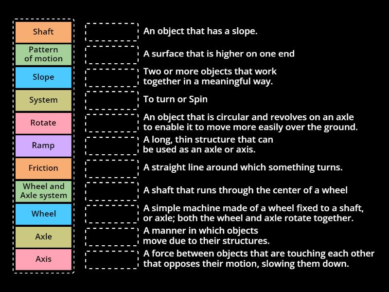 Axis - A straight line around which something turns. , Axle - A shaft that runs through the center of a wheel , Friction - A force between objects that are touching each other that opposes their motion, slowing them down., Pattern of motion - A manner in which objects move due to their structures., Ramp - An object that has a slope., Rotate - To turn or Spin, Shaft - A long, thin structure that can be used as an axle or axis., Slope - A surface that is higher on one end, System - Two or more objects that work together in a meaningful way., Wheel - An object that is circular and revolves on an axle to enable it to move more easily over the ground., Wheel and Axle system - A simple machine made of a wheel fixed to a shaft, or axle; both the wheel and axle rotate together.,