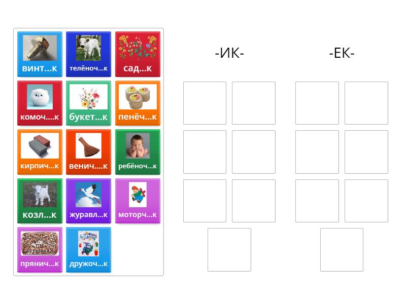 -ИК-: букет...к, журавл...к, сад...к, винт...к, козл...к, кирпич...к, моторч...к, -ЕК-: дружоч...к, пенёч...к, ребёноч...к, телёноч...к, венич....к, прянич...к, комоч....к,