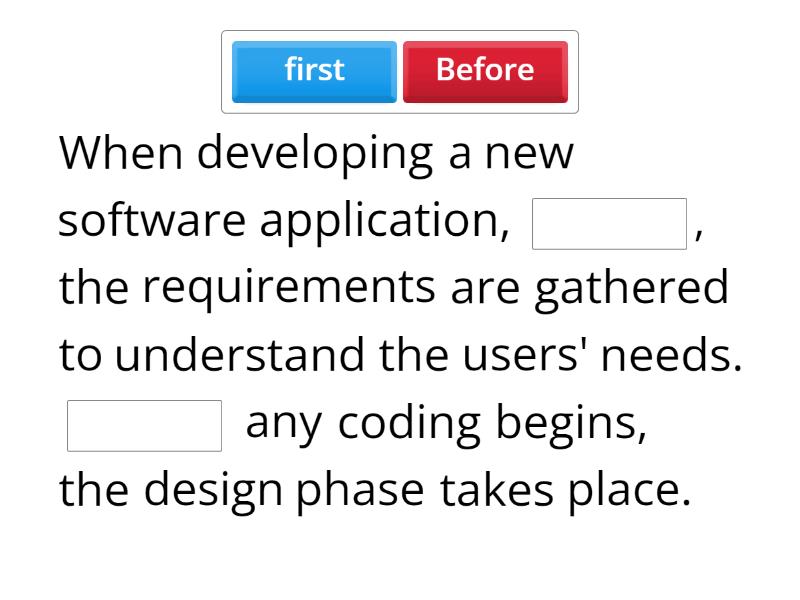 When developing a new software application, ____, the requirements are gathered to understand the users' needs. ____ any coding begins, the design phase takes place. ____ that, the development team starts writing the code. ____ this phase, the team works closely together to ensure that the software meets all specifications. ____, the code undergoes testing to identify any bugs. ____, the software becomes stable, and ____, it's ready for deployment. ____ the testing phase is complete, the software is deployed to the production environment. ____, the team closely monitors for any issues. ____, updates or patches may be released if necessary. ____ the initial launch, the software has been maintained regularly to ensure its performance. ____, the team is working on new features. ____, user feedback is collected to guide future updates. ____, the software may undergo major upgrades. ____ all features have been implemented and tested, the project is considered complete. ____, the software reaches end-of-life, and ____ then, it will continue to receive support. ____, this process took months, but now, with agile methodologies, development cycles are much shorter.