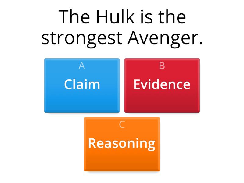 1) The Hulk is the strongest Avenger. a) Claim b) Evidence c) Reasoning 2) The dictionary says a sandwich is 2 pieces of bread with some filling. a) Claim b) Evidence c) Reasoning 3) North Carroll school is lunch is healthy. a) Claim b) Evidence c) Reasoning 4) 100% of North Carroll school lunches include fruits and vegetables. a) Claim b) Evidence c) Reasoning 5) A quesadilla is a sandwich. a) Claim b) Evidence c) Reasoning 6) North Carroll School lunches must be healthy because they include important nutrients. a) Claim b) Evidence c) Reasoning 7) We know red is the favorite flavor because kids are picking it first. a) Claim b) Evidence c) Reasoning 8) No other Avengers can lift a building, so Hulk has to be the strongest. a) Claim b) Evidence c) Reasoning 9) A quesadilla counts as a sandwich because the tortilla is the bread. a) Claim b) Evidence c) Reasoning 10) In an experiment, students chose red starbursts first 75% of the time. a) Claim b) Evidence c) Reasoning 11) In the movies, the Hulk lifts an entire building. a) Claim b) Evidence c) Reasoning 12) Red starbursts are the most popular flavor. a) Claim b) Evidence c) Reasoning