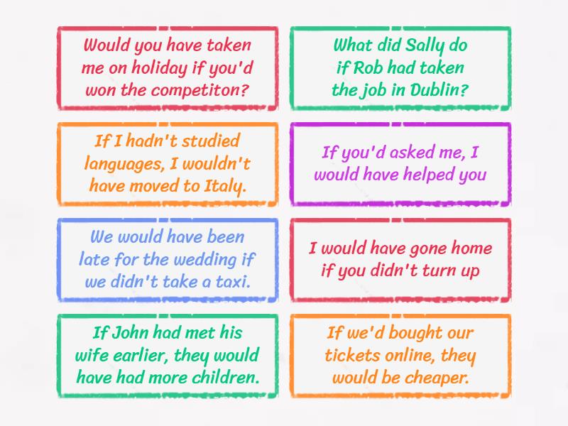 We would have been late for the wedding if we didn't take a taxi. - X hadn't taken, Would you have taken me on holiday if you'd won the competiton? - Correct, If we'd bought our tickets online, they would be cheaper. - X would have been, I would have gone home if you didn't turn up - X hadn't turned up, If John had met his wife earlier, they would have had more children. - Correct, If you'd asked me, I would have helped you - Correct, What did Sally do if Rob had taken the job in Dublin? - X would Sally have done, If I hadn't studied languages, I wouldn't have moved to Italy. - Correct,