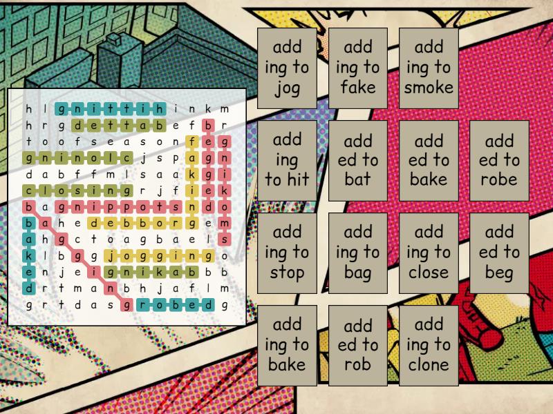 stopping - add ing to stop, cloning - add ing to clone, hitting - add ing to hit, jogging - add ing to jog, bagging - add ing to bag, baking - add ing to bake, baked - add ed to bake, faking - add ing to fake, begged - add ed to beg, closing - add ing to close, robed - add ed to robe, robbed - add ed to rob, smoking - add ing to smoke, batted - add ed to bat,