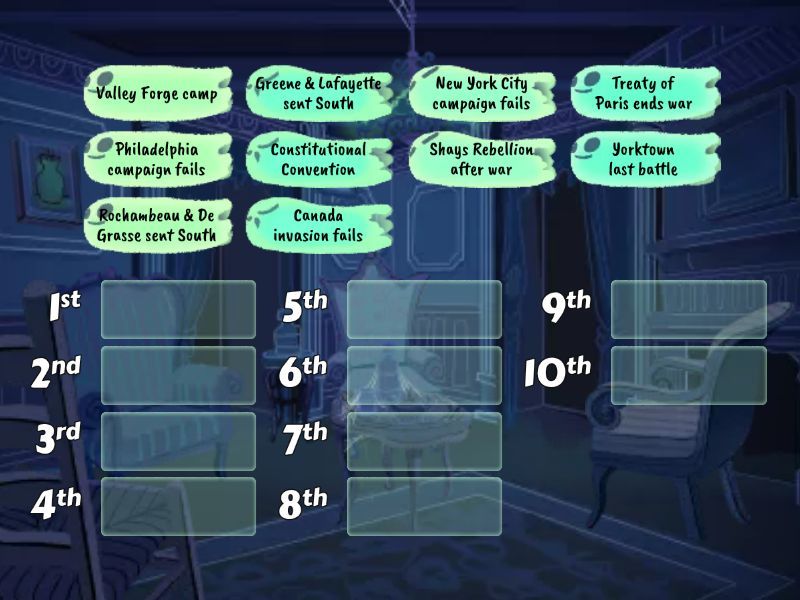 Canada invasion fails, New York City campaign fails, Philadelphia campaign fails, Valley Forge camp, Greene & Lafayette sent South, Rochambeau & De Grasse sent South, Yorktown last battle, Treaty of Paris ends war, Shays Rebellion after war, Constitutional Convention.