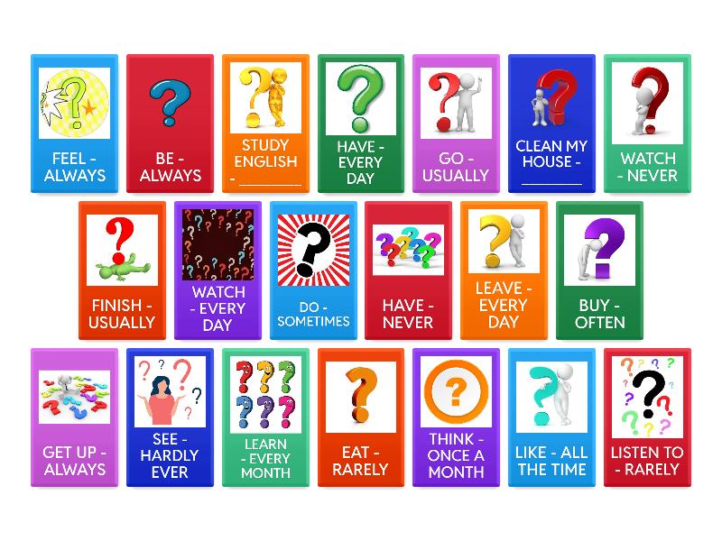 BE - ALWAYS, HAVE - EVERY DAY , GO - USUALLY, EAT - RARELY, HAVE - NEVER, DO - SOMETIMES, LEAVE - EVERY DAY , WATCH - NEVER, SEE - HARDLY EVER, BUY - OFTEN, GET UP - ALWAYS, FINISH - USUALLY, LISTEN TO - RARELY, WATCH - EVERY DAY, LEARN - EVERY MONTH, FEEL - ALWAYS, THINK - ONCE A MONTH, CLEAN MY HOUSE - ________, STUDY ENGLISH - ________, LIKE - ALL THE TIME,