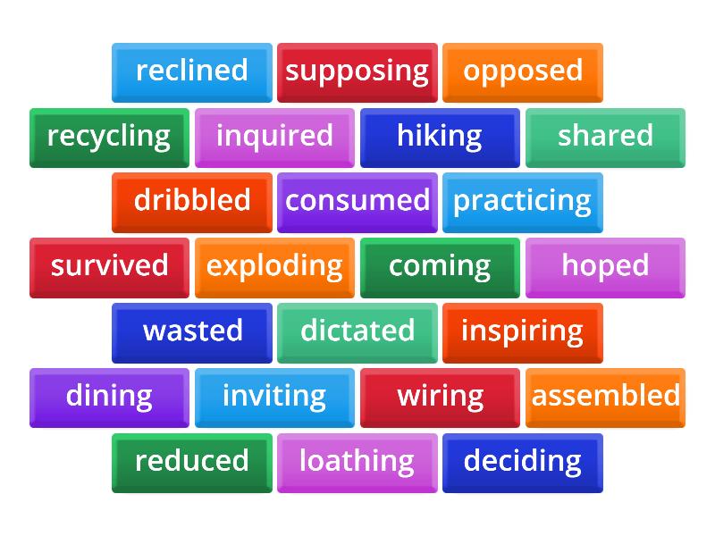 wiring - wire, wasted - waste, hoped - hope, practicing - practice, deciding - decide, shared - share, coming - come, dining - dine, hiking - hike, inviting - invite, dictated - dictate, supposing - suppose, reclined - recline, survived - survive, inspiring - inspire, recycling - recycle, dribbled - dribble, assembled - assemble, inquired - inquire, exploding - explode, loathing - loath, opposed - oppose, reduced - reduce, consumed - consume,