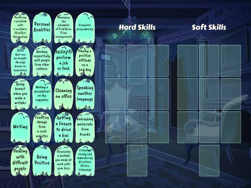 Hard Skills: Computer programming, Counting change from a cash register, Unloading materials from trucks, Getting a license to drive a bus, Making a spreadsheet on the computer, Cleaning an office, Speaking another language, Skills that can be taught through hands on experience, Ability to perform a job or task, Writing, Soft Skills: Discussing a mistake you made at work with your boss, Working respectfully with people from other cultures, Resolving a problem with a customer (Conflict Resolution), Listening closely and remembering directions (Active Listening), Managing the schedules of 5 children (Time management), Dealing with difficult people, Being honest when you make a mistake, Having a positive attitude on a bad day, Personal Qualities, Being Positive,