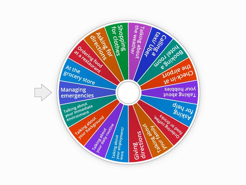 1) At the grocery store 2) Ordering food at a restaurant 3) Asking for directions 4) Shopping for clothes 5) Talking about the weather 6) Calling a taxi/ Uber 7) Booking a hotel room 8) Check-in at the airport 9) Talking about your hobbies 10) Asking for help 11) Ordering coffee, food or drinks 12) Talking about your family  13) Giving directions 14) Talking about your employment/ work 15) Talking about your daily routine 16) Talking about your background  17) Talking about your immediate environment 18) Managing emergencies