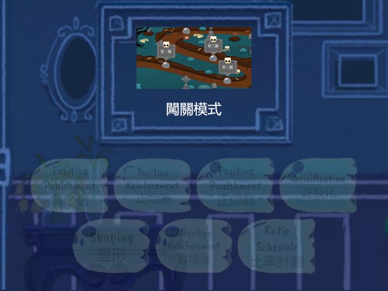 Shaping 塑形 - 闖關模式, Gamification 遊戲化 - 萬聖節主題遊戲, Ratio Schedule 比率計劃 - 獲勝者抽取無法預測的「獎勵」, Positive Reinforement 正增强 - 加分制詞語競賽, Negative Reinforement 負增强 - 獲勝組豁免一次課後作業, Positive Punishment 正懲罰 - 如回答錯誤,重複正確詞句三遍, Positive Punishment 負懲罰 - 違反紀律者扣分,