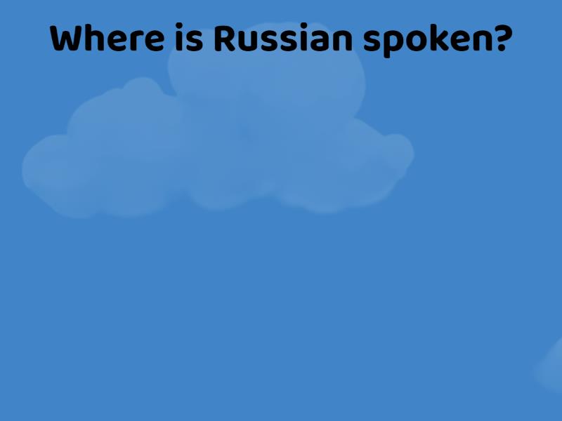 1) What language family does Russian belong to? a) Romance b) Germanic c) Slavic d) Latin 2) Where is Russian spoken? a) Russia b) Ukraine c) Germany d) Rome 3) What language is similar to Russian? a) Ukranian b) Croatian c) Polish d) Latin e) Spanish f) English 4) How do you say "hello" in Russian? a) Ochen priyatno b) Zdravstvuyte c) Spasiba d) Do svidanya 5) How do you say "hi" in Russian? a) Do svidanya b) Kak vas zovut? c) Dobryj vyechyer d) Privet 6) How do you say "My name is" in Russian? a) Menya zovut b) Kak vas zovut c) Zdravstvuyte d) Ochen priyatno 7) How do you say "Please" in Russian? a) Zdravstvuyte b) Spasiba c) Zovut d) Pozhalusta 8) How do you say "thank you" in Russian? a) Pozhalusta b) Dobroye utro c) Spasiba d) Zdravstvuyte 9) How do you say "Good-bye" in Russian? a) Kak vas zovut b) Do svidanya c) Pozhalusta d) Privet 10) True or False: Russia is the largest country in the world (by area)? a) True b) False