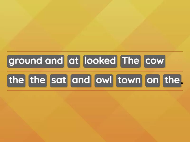 The cow and the owl sat on the ground and looked at the town. , The clown shouted at the mouse to get out of his way., The red thread was spread all over the shed.,