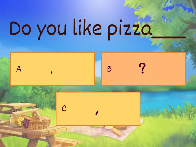 1) Do you like pizza___ a) . b) ? c) , 2) I am from Jordan___ a) . b) ? c) , 3) Do you live in Palestine___ a) . b) ? c) , 4) I like eating bananas____ appels, and pears. a) . b) ? c) , 5) What's your favorite snack___ a) . b) ? c) , 6) I live with my mom___my dad___my sister___ and my brother. a) . b) ? c) , 7) I study English___ a) . b) ? c) , 8) Are you from Poland___ a) . b) ? c) , 9) Does she need a pen___ a) . b) ? c) , 10) I go to the park___ a) . b) ? c) , 11) I have got a book___a pen, and a sharpener. a) . b) , c) ?