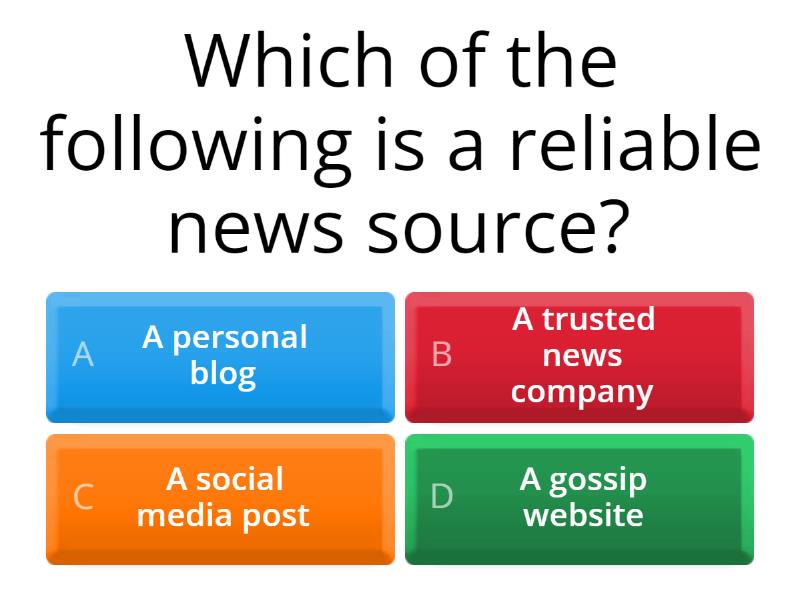 1) Which of the following is a reliable news source? a) A personal blog b) A trusted news company c) A social media post d) A gossip website 2) What should you look for in a reliable news source a) Dramatic headlines b) Biased reporting c) Fact-checking d) Information that hasn't been checked 3) Which of the following is a sign of a reliable news source? a) Lots of new information without proof b) Claims without evidence c) Anonymous authors d) Clear contact information 4) Why is it important to check the author of a news article? a) To see if they are famous b) To see if they know what they're talking about c) To find out their age d) To find out their political views 5) What is the purpose of fact-checking websites? a) To promote shocking news b) To spread misinformation c) To entertain readers d) To check if the information is true 6) A reliable news source will always have a bias. a) True b) False 7) It is ok to share news without checking if it's true. a) True b) False 8) Trusted news companies often have groups of people who check the news is correct. a) True b) False 9) Social media is a reliable source of news. a) True b) False 10) Checking multiple sources can help you determine the reliability of information. a) True b) False