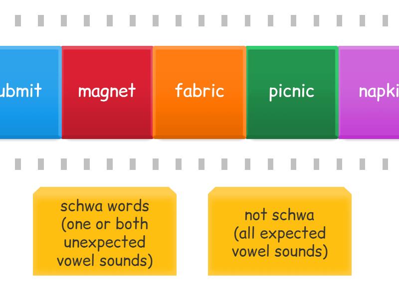 schwa words (one or both unexpected vowel sounds): magnet, attend, channel, compel, jacket, lesson, rocket, kitten, commit, tunnel, basket, not schwa (all expected vowel sounds): zigzag, submit, combat, sunset, muffin, napkin, shiplap, picnic, fabric, rabbit, goblin,
